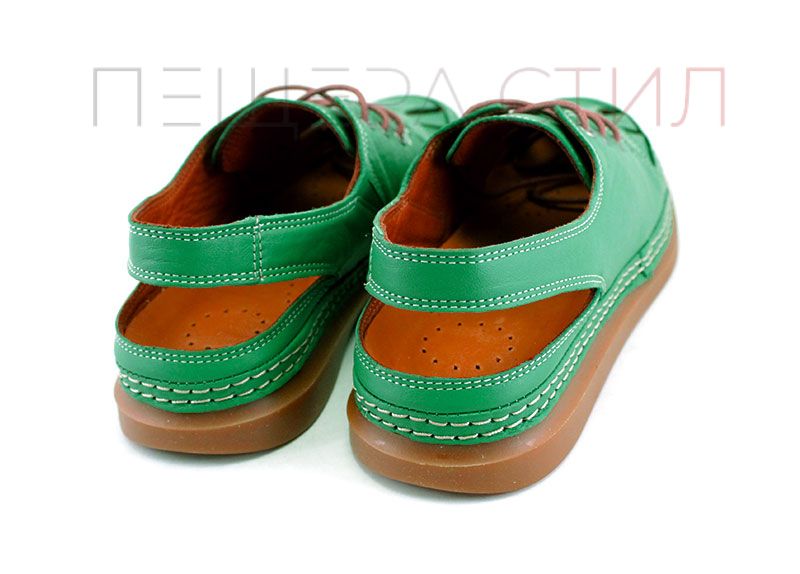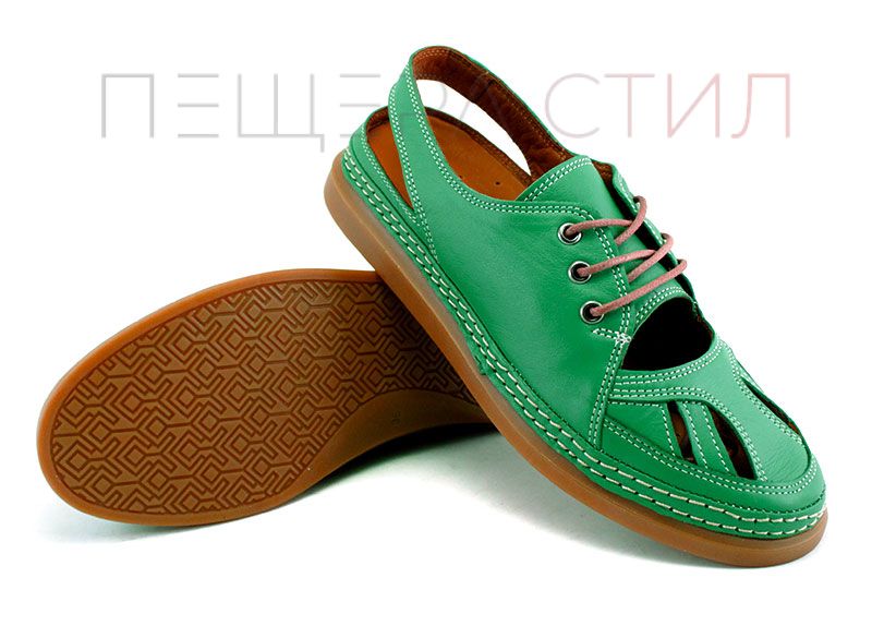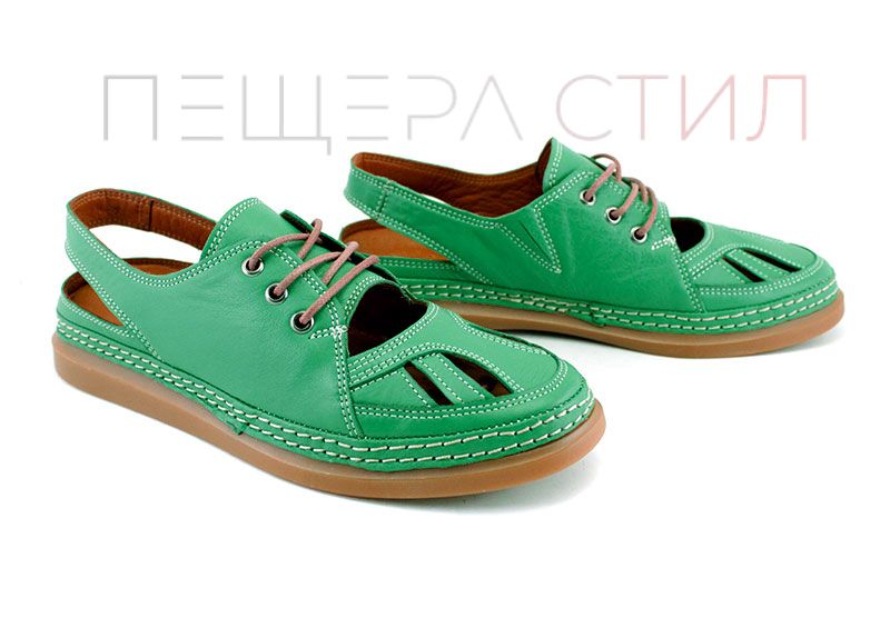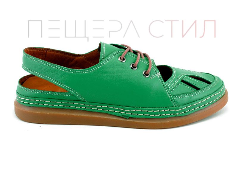 Încălțăminte de vară pentru femei, realizată din piele naturală, moale, cu o căptușeală subțire din piele naturală, cu perforație completă, care trece prin căptușeală pe o talpă joasă, din cauciuc.
