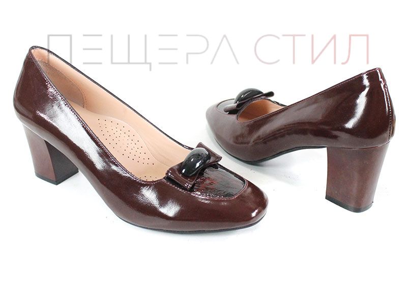 Rubino sunt pantofi eleganți pentru damă, din lac natural bordo. Model cu toc stabil, branț și căptușeală din piele naturală, decorat cu un detaliu sofisticat.