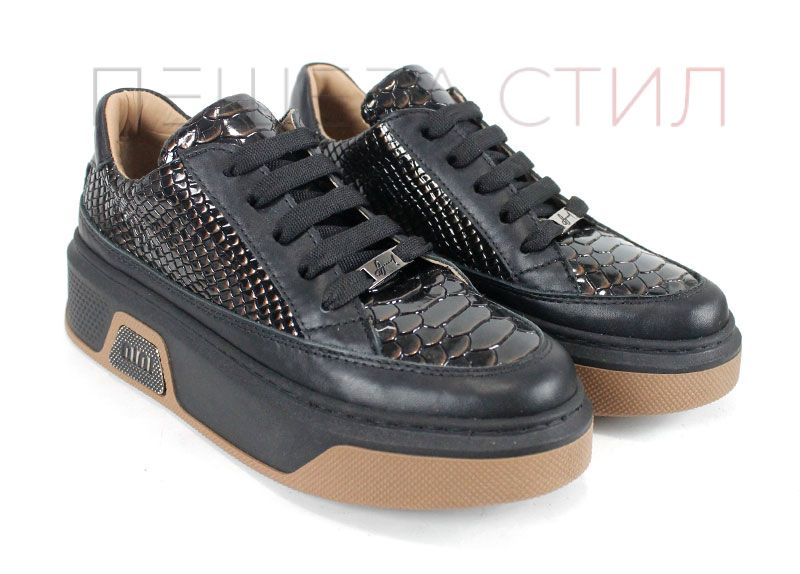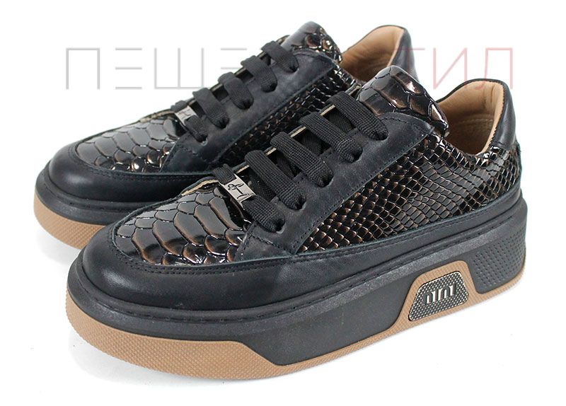 Vita Elegante în varianta neagră este un model sofisticat, creat pentru femeile care apreciază luxul modern. Construiți din piele naturală și lac cu imprimeu de șarpe, acești pantofi se remarcă prin talpa groasă cusută și contrastul elegant cu marginea bej. Interiorul din piele naturală asigură confort pe termen lung.