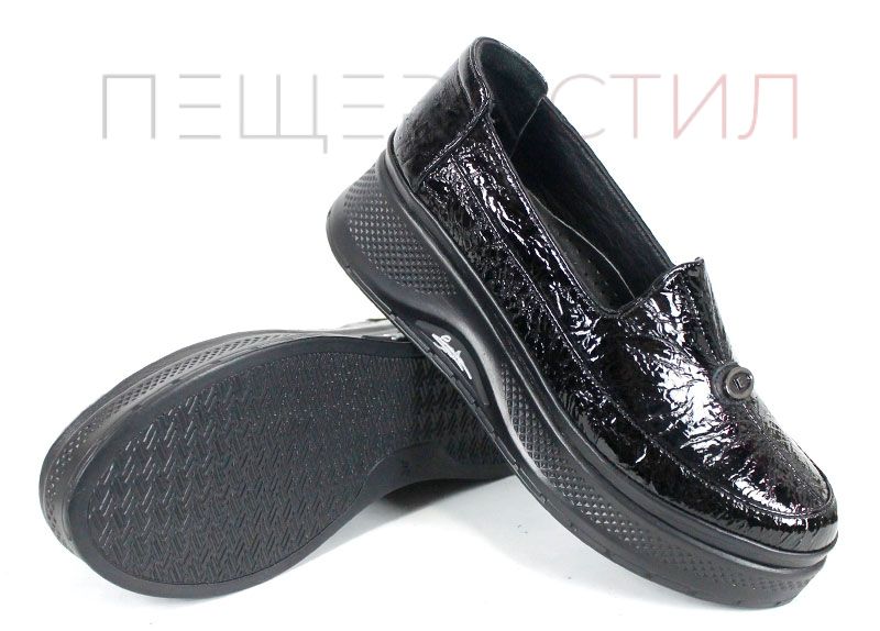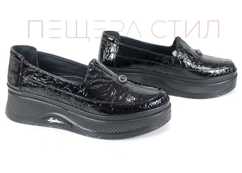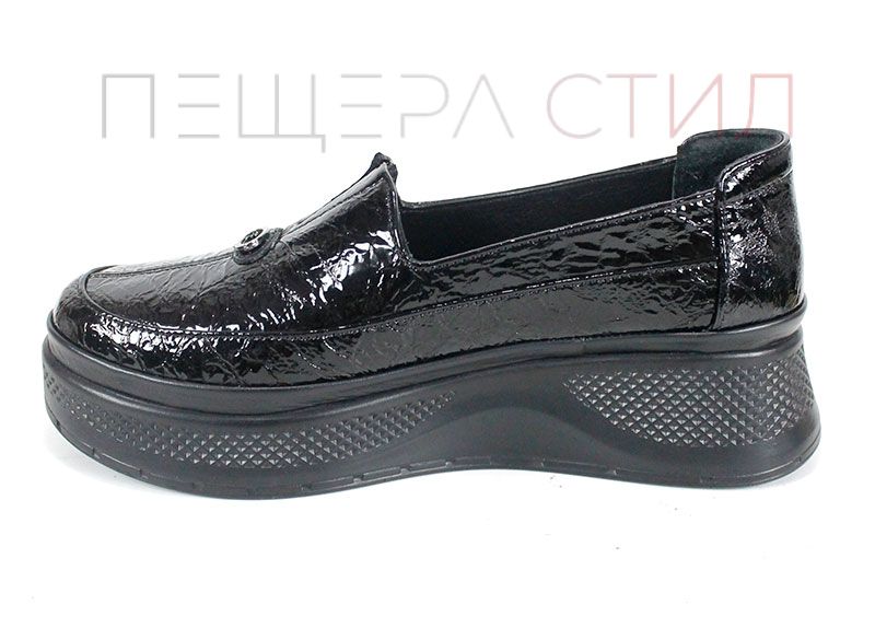 Luce Nera este un model de pantofi damă pentru zi cu zi, realizați din lac natural moale, cu efect șifonat și culoare neagră. Platforma joasă și interiorul din piele naturală asigură confort și eleganță.