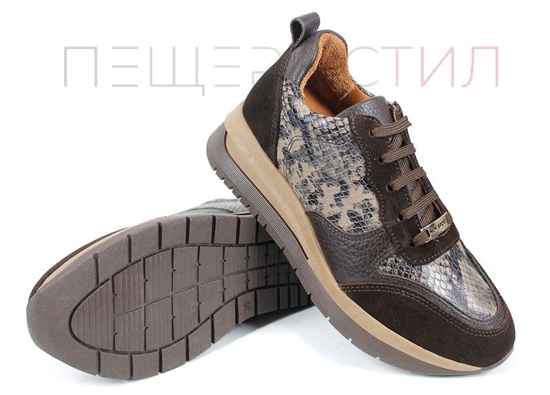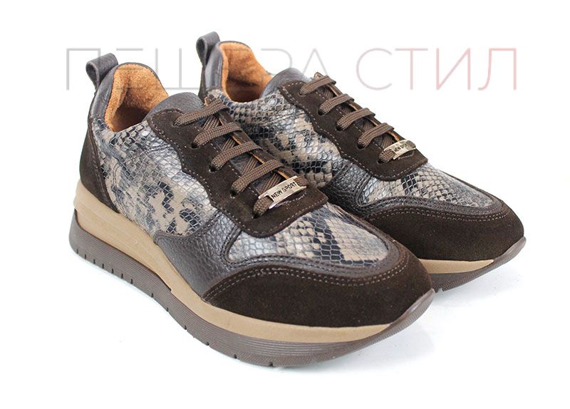 Pantofii sport pentru dame Elea sunt realizați din piele naturală – piele întoarsă maro, piele floater și imprimeu șarpe. Interior complet din piele naturală pentru confort și respirabilitate.
