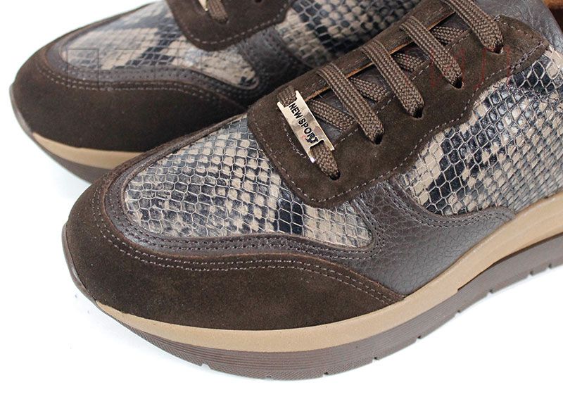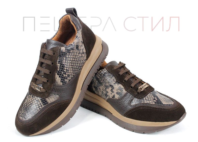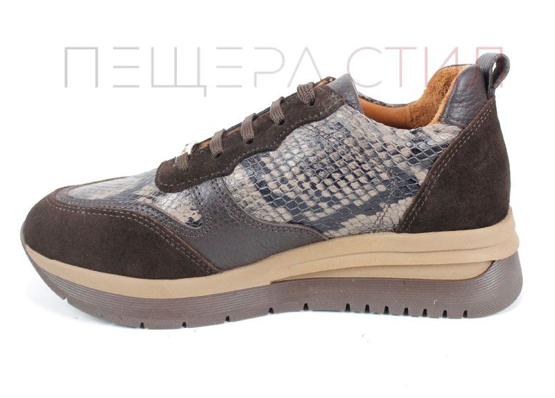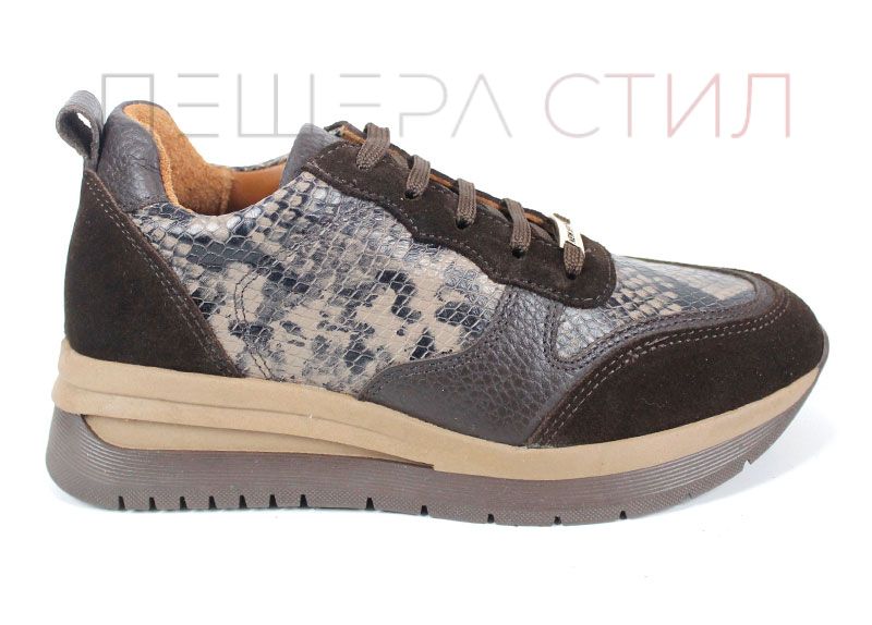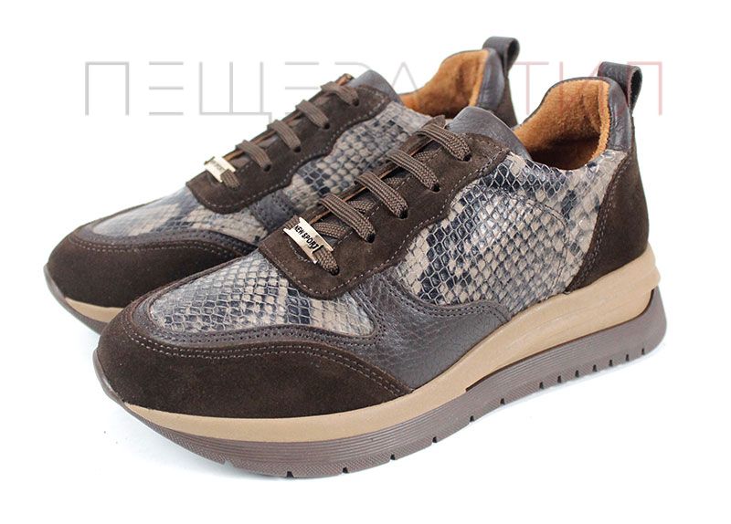 Pantofi sport dama Elea – piele întoarsă maro, piele floater și imprimeu șarpe