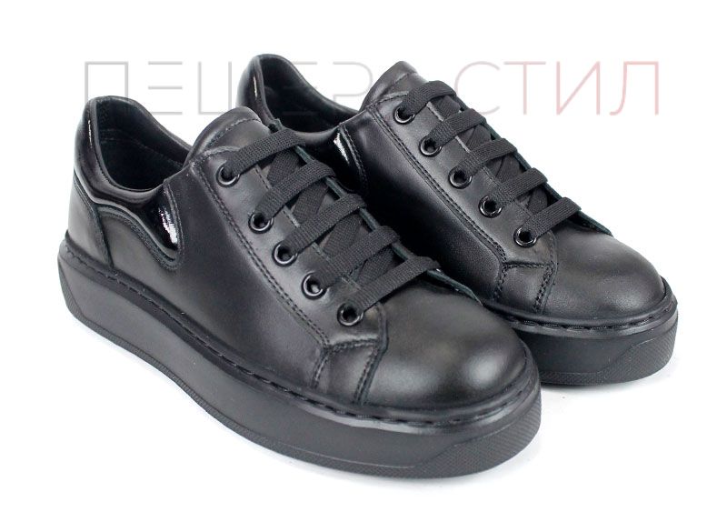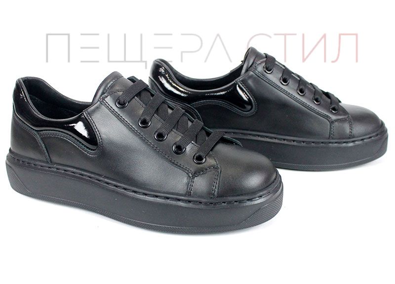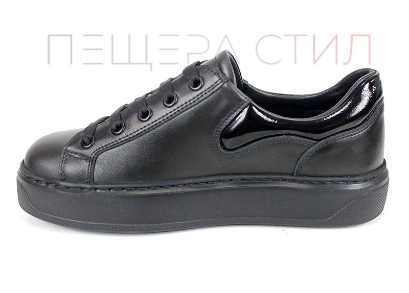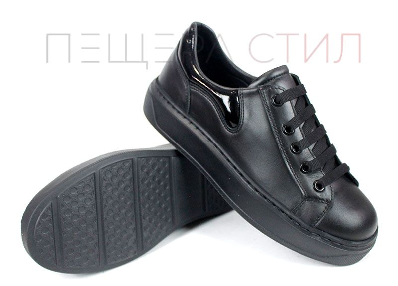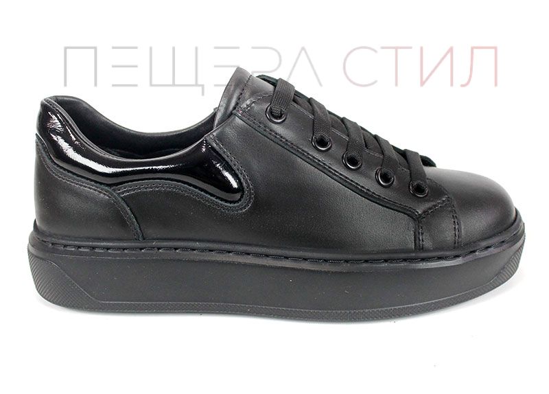 Sneakers pentru femei din piele naturală și lac negru, cu talpă sport cusută și flexibilă. Interior complet din piele naturală, oferind confort și respirabilitate în fiecare pas. Ideal pentru purtare zilnică.