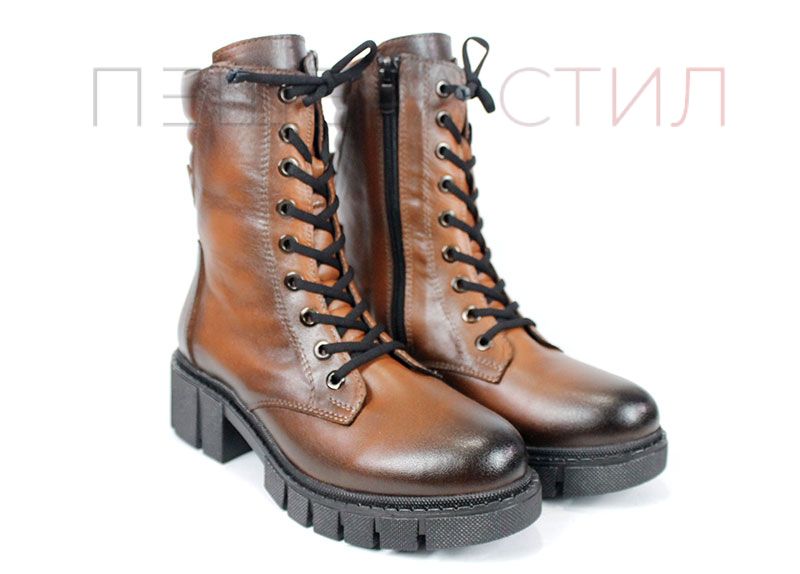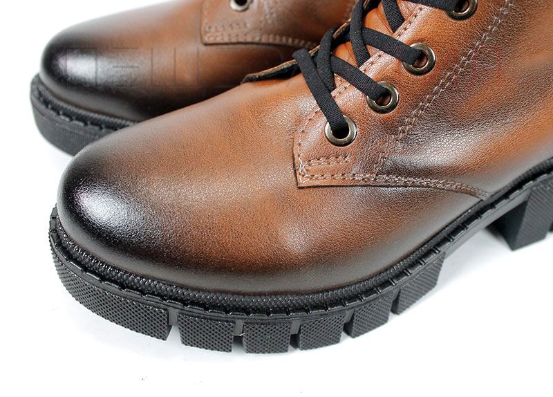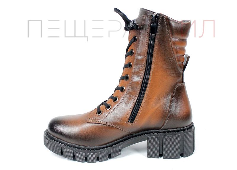 Ghete elegante din piele naturală maro deschis, cu efect antichizat și nuanțe închise pe detalii. Talpă comodă cu toc mediu, șireturi, fermoar și blană călduroasă.