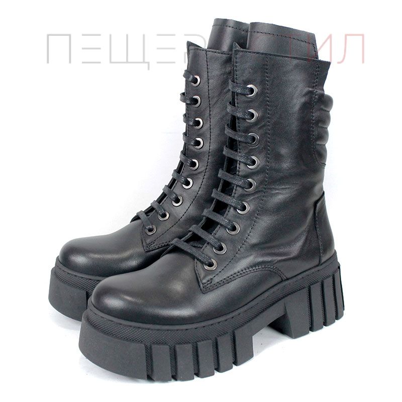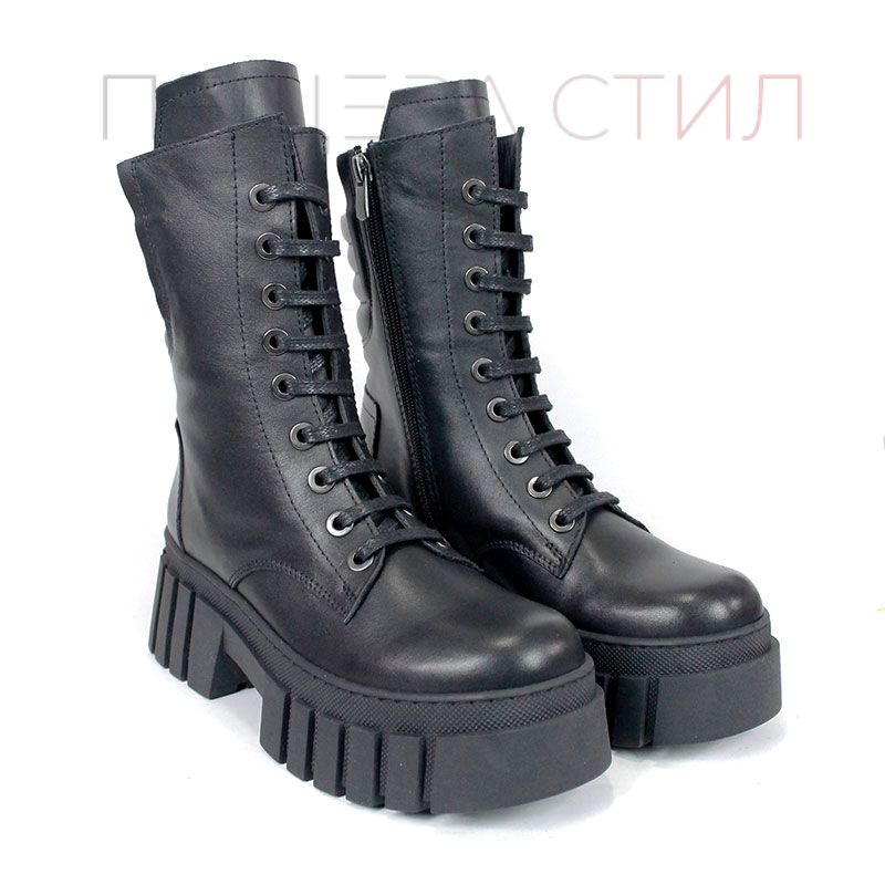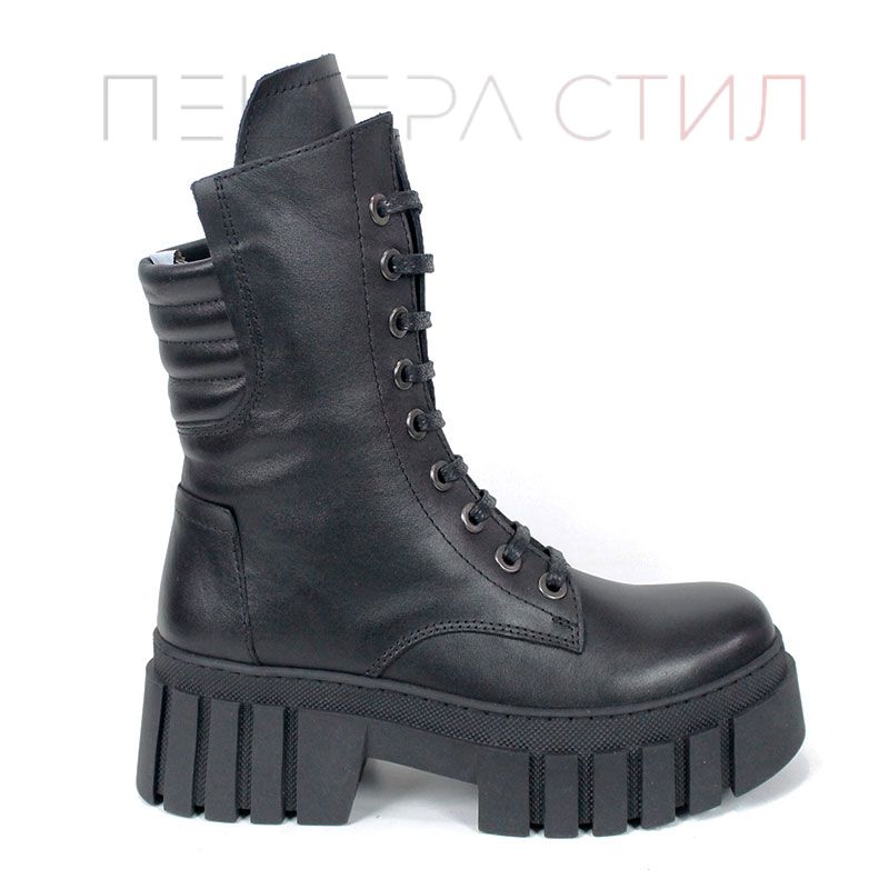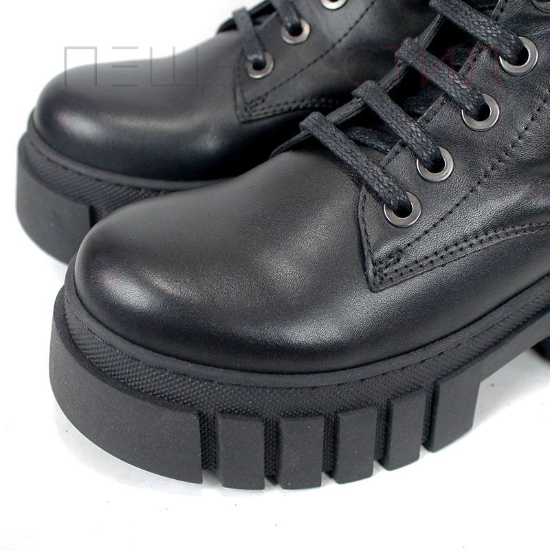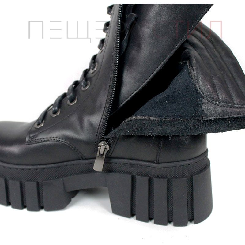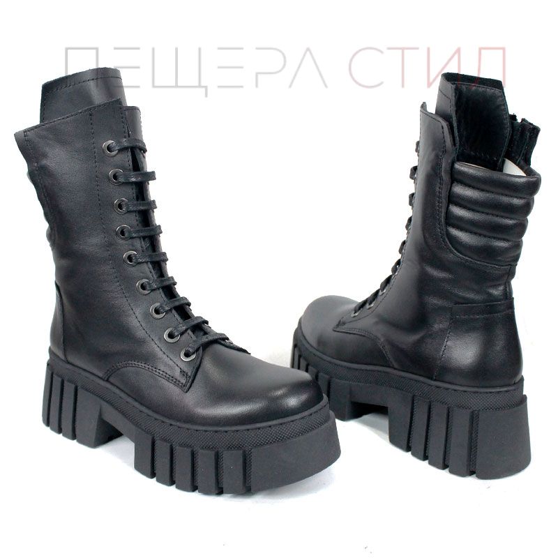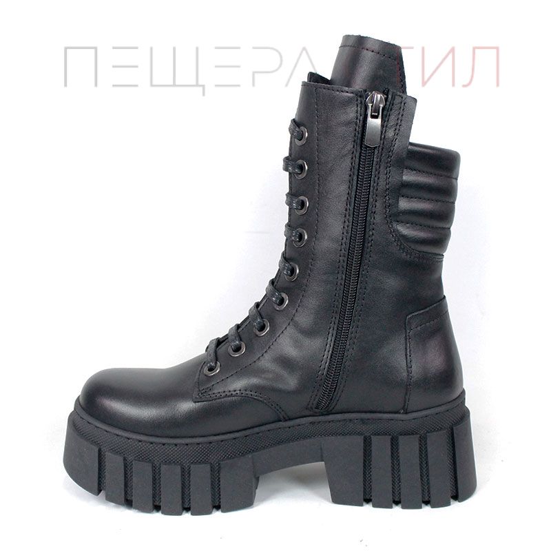 Ghete moderne din piele naturală, negre, cu talpă comodă de înălțime medie, șireturi și fermoar lateral pentru încălțare rapidă. Căptușeală moale la gambă pentru confort sporit.