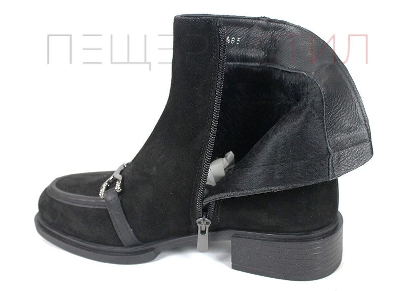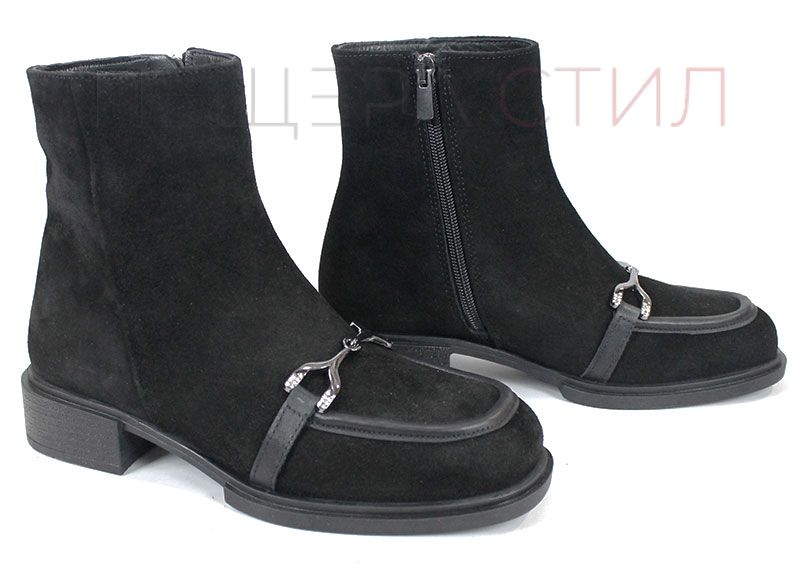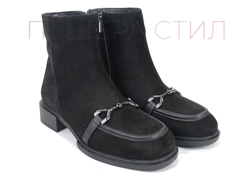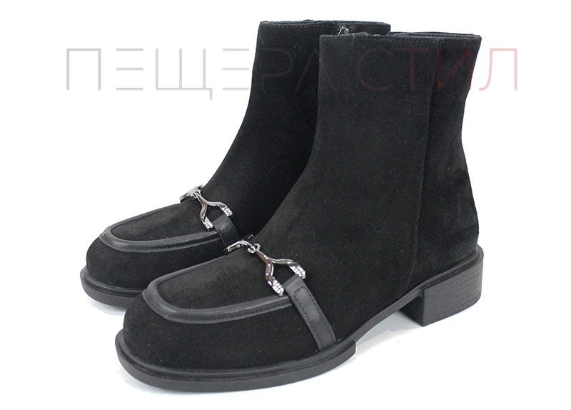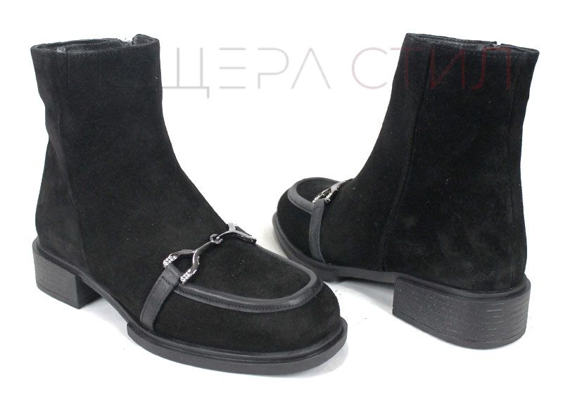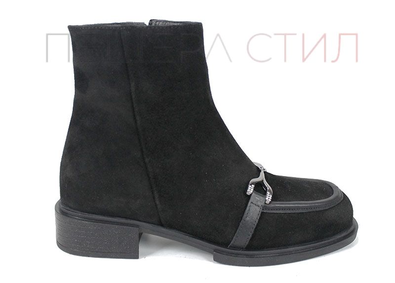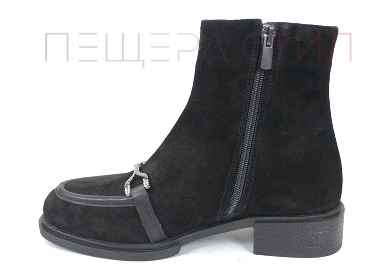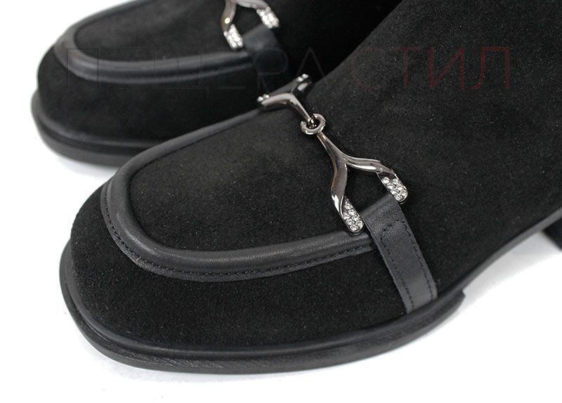 Eleganza impresionează prin velurul natural negru, tocul mic confortabil și accesoriul metalic modern din față. Ideal pentru ținute zilnice și elegante.