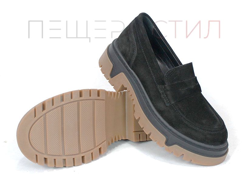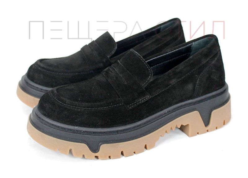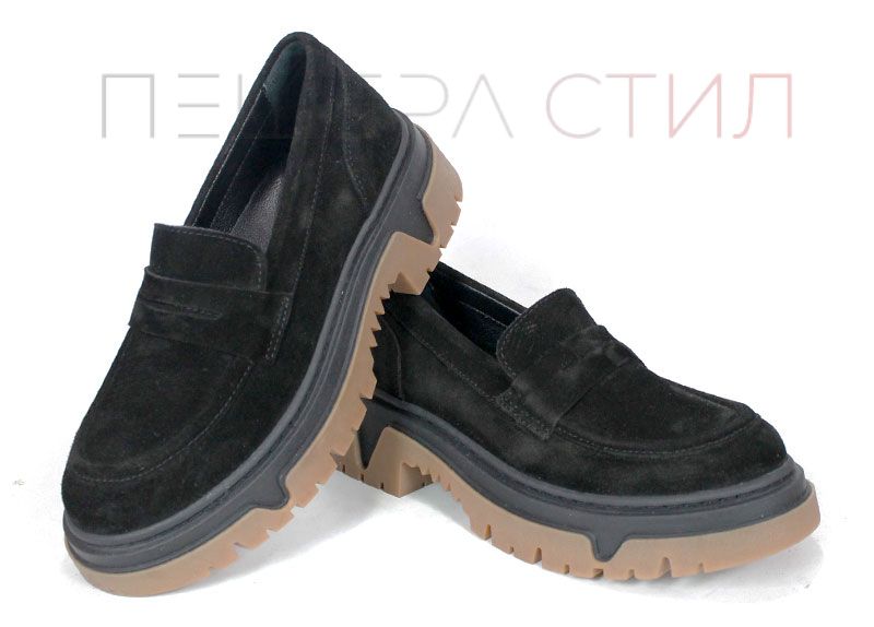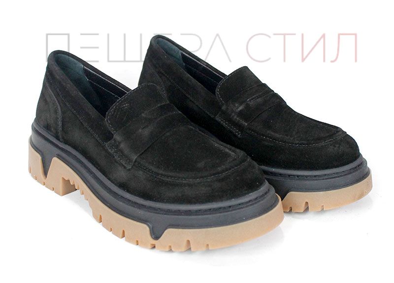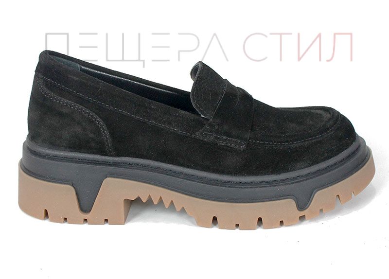 Pantofi loafer damă Aurora Line din velur natural negru, cu design clasic și talpă groasă modernă, având bază contrastantă maro. Interiorul este realizat din piele naturală pentru confort zilnic.