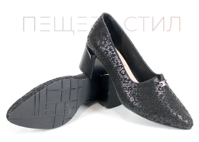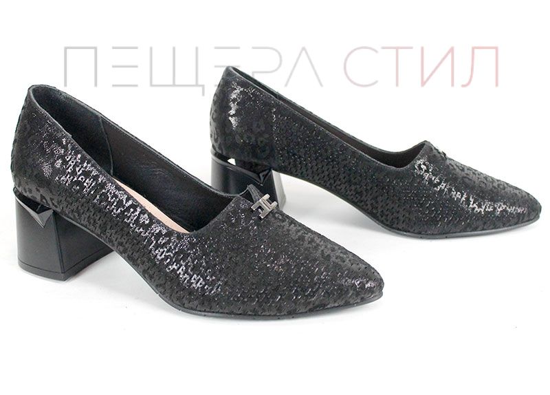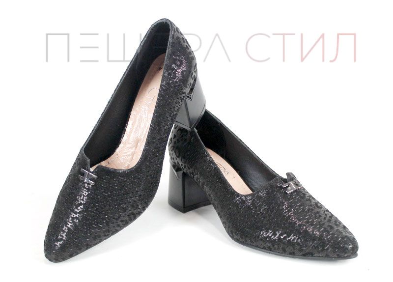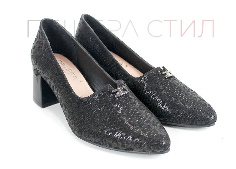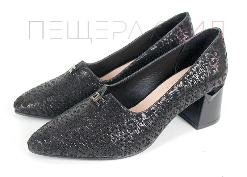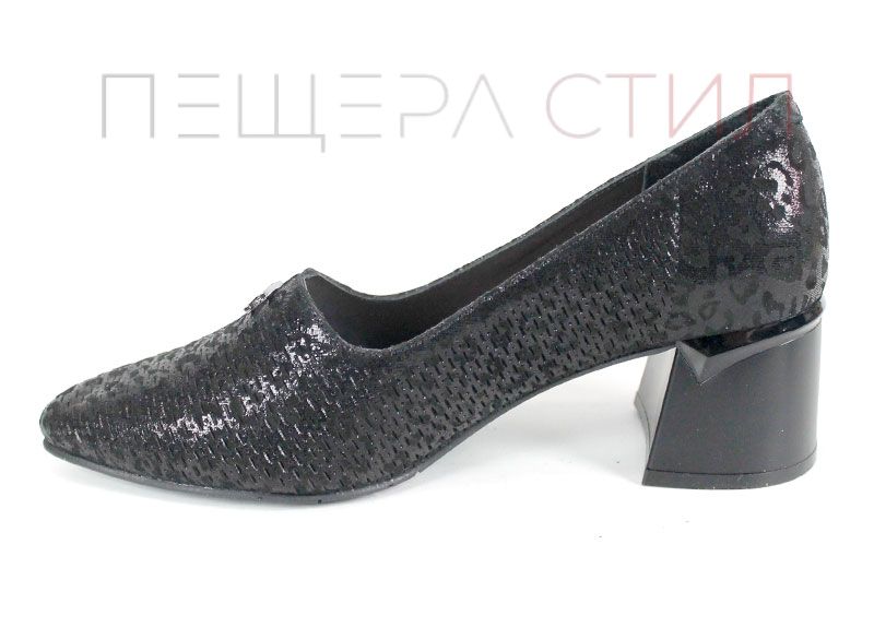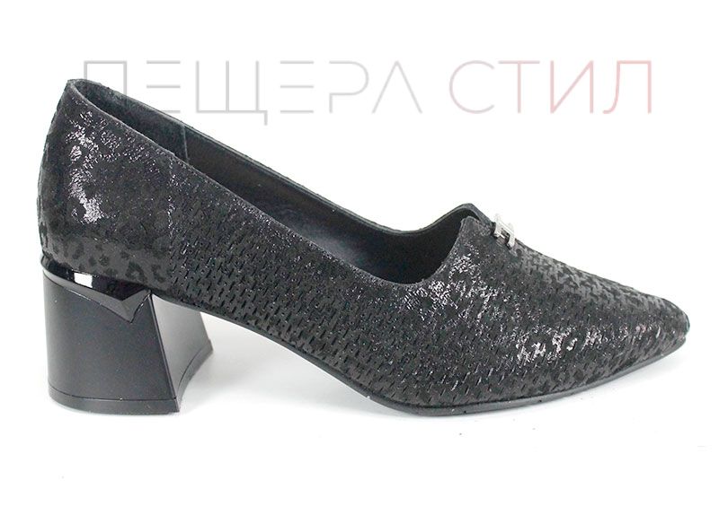 Pantofi eleganți de damă confecționați din piele naturală neagră, cu perforație fină și imprimeu leopard discret. Modelul este prevăzut cu toc mediu, stabil, căptușeală și branț din piele naturală, fiind potrivit atât pentru mediul office, cât și pentru ocazii speciale.