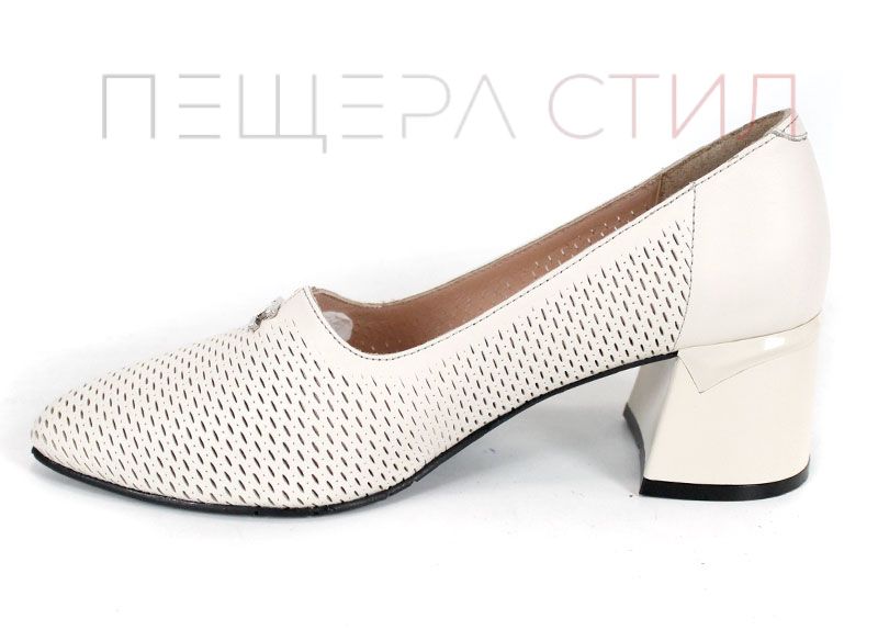 Civella sunt pantofi damă eleganți de vară, realizați din piele naturală bej cu perforații fine. Modelul este prevăzut cu toc mediu stabil, căptușeală și branț din piele naturală, oferind confort și eleganță pe tot parcursul zilei.