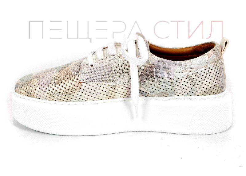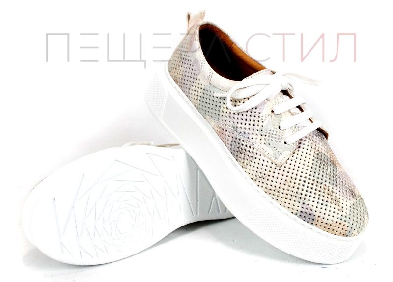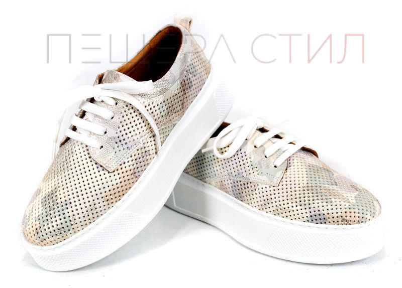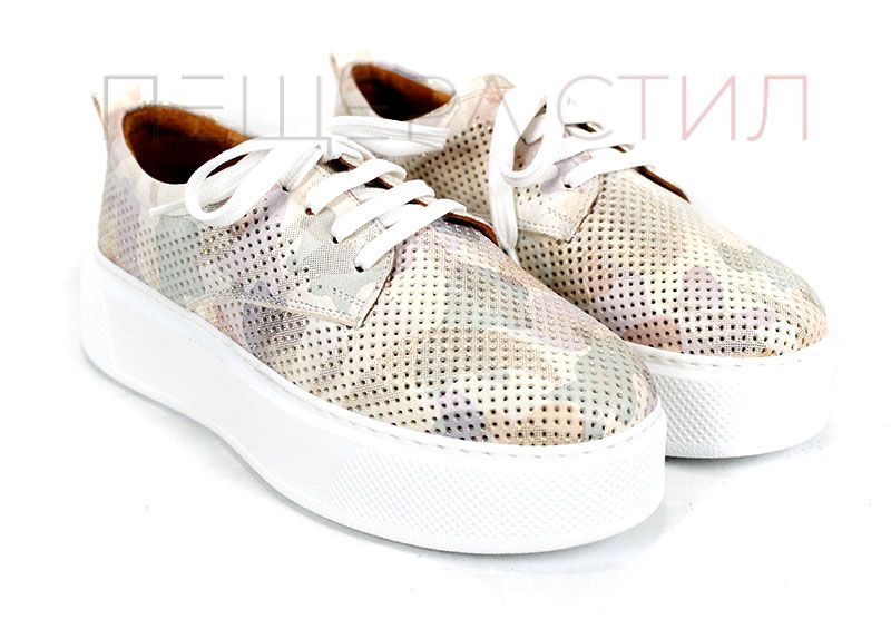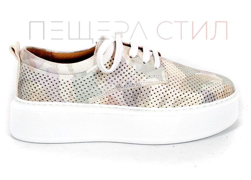 Aira Calm sunt pantofi de vară pentru damă realizați din piele naturală perforată, cu imprimeu camuflaj în nuanțe de bej. Talpa albă, cusută și ușoară, împreună cu căptușeala și branțul din piele naturală oferă confort ridicat pe tot parcursul zilei.