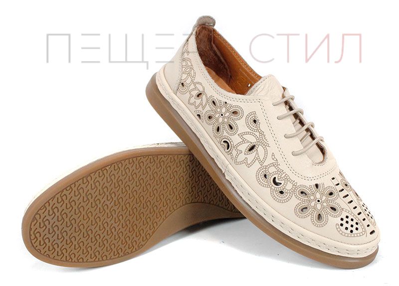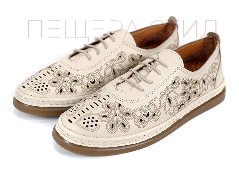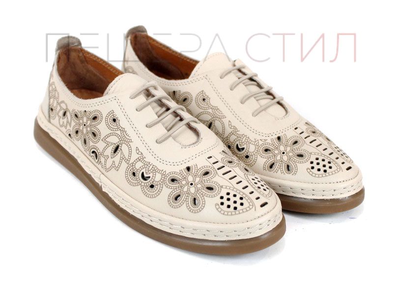 Perforațiile cu motive florale nu sunt doar decorative – ele permit circulația aerului și mențin un climat confortabil în interior, chiar și în zilele călduroase. Nuanța bej adaugă versatilitate și permite integrarea ușoară în diferite ținute.