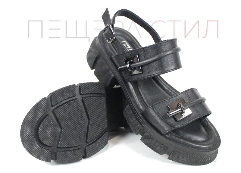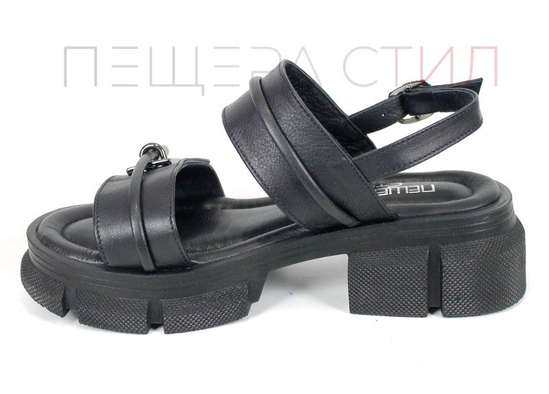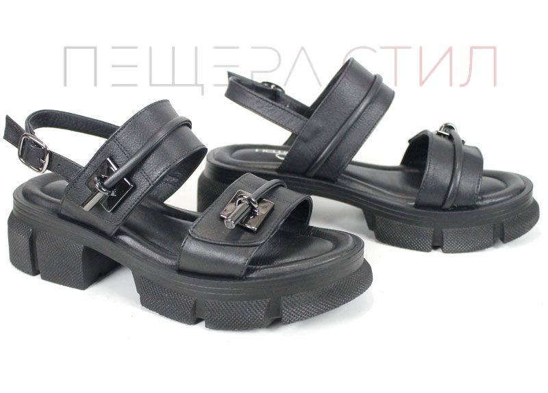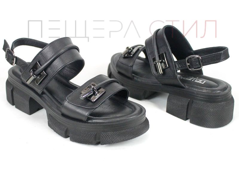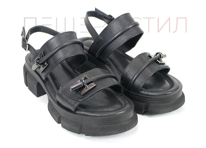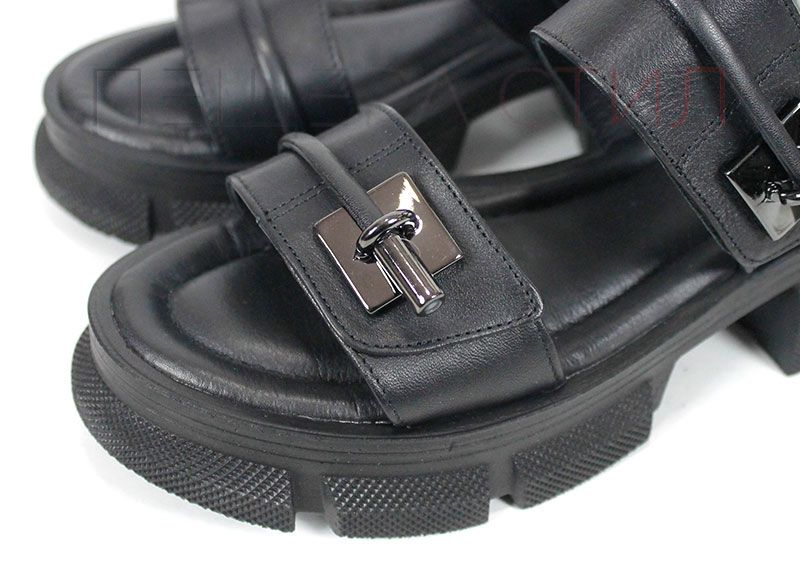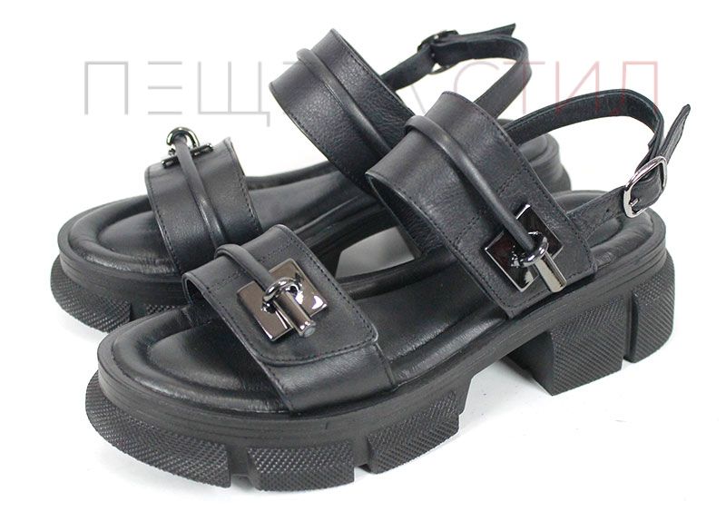 Sandale damă din piele naturală neagră cu talpă masivă și accente metalice – stil puternic și stabilitate.