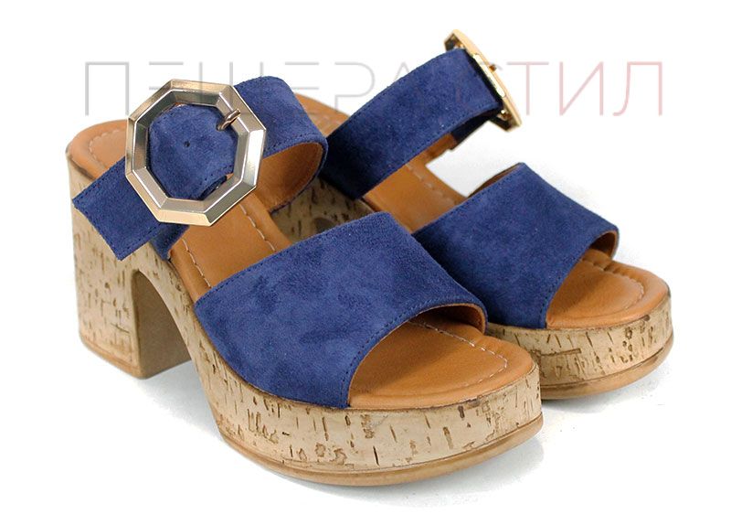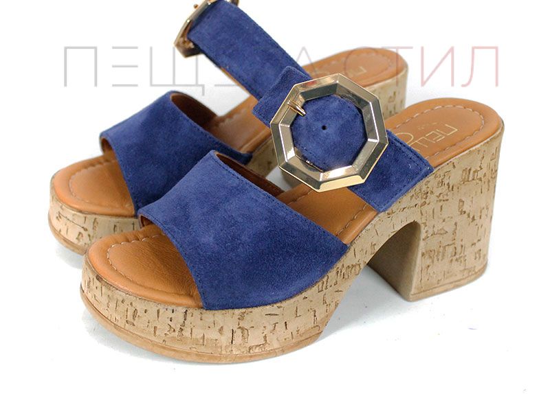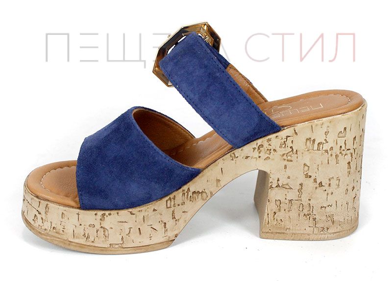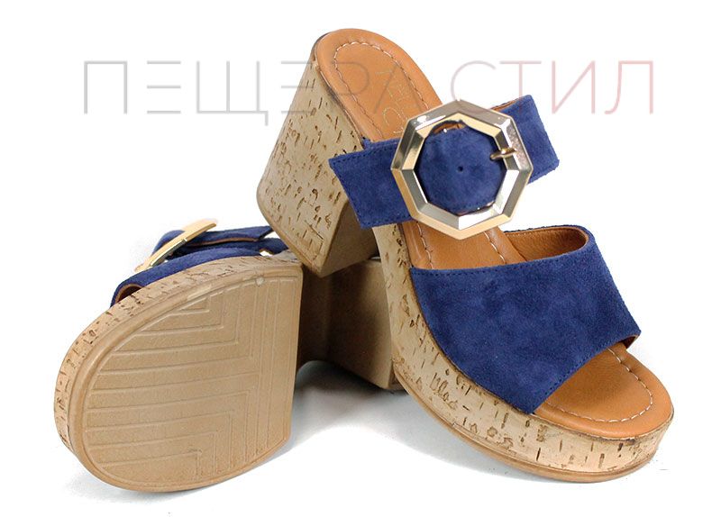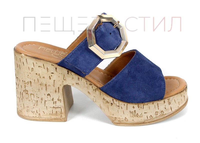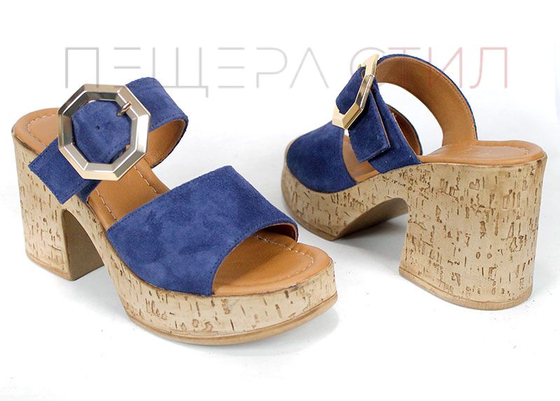 Papuci de damă din velur natural, în nuanță albastru intens, cu platformă stabilă și cataramă decorativă aurie.