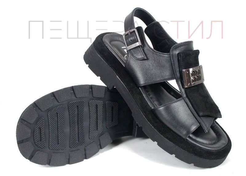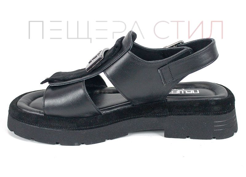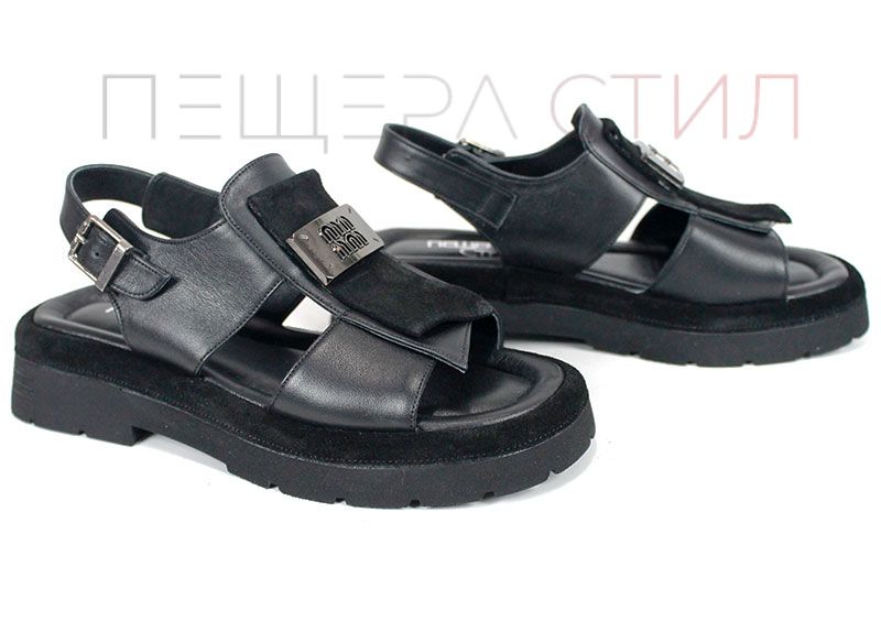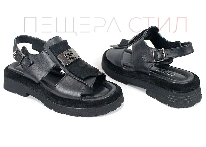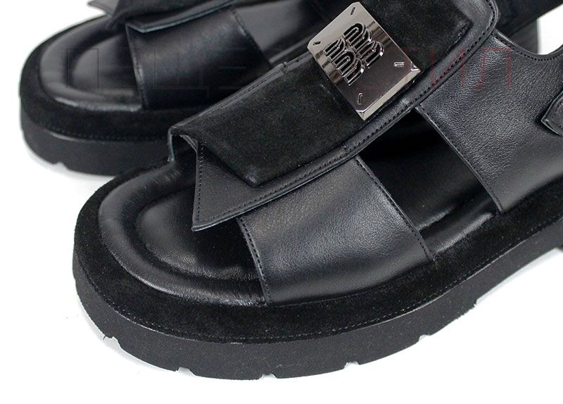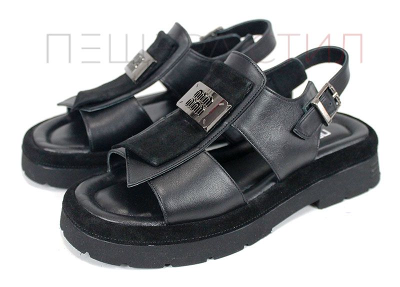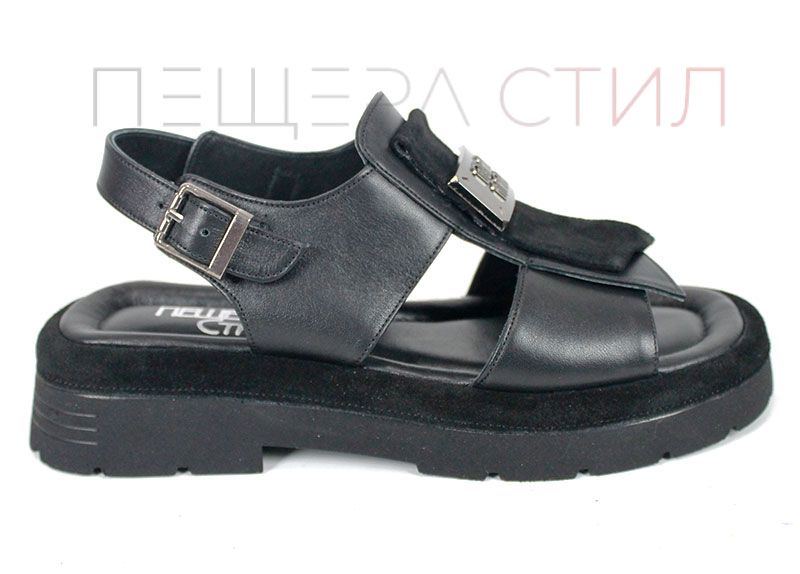 Sandale moderne de damă din piele naturală, în culoare neagră, cu talpă masivă și element metalic decorativ.